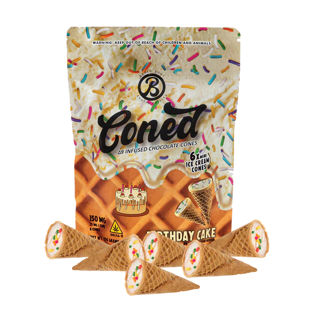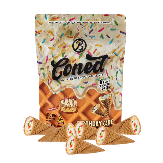 Turn every day into a celebration with CONED Birthday Cakes. These indulgent mini-cones combine the comforting flavor of vanilla cake with a smooth chocolate frosting, all infused with 100 mg of Delta-8 THC per cone. A delicious and potent experience, designed for those with a sweet tooth and a strong personality.